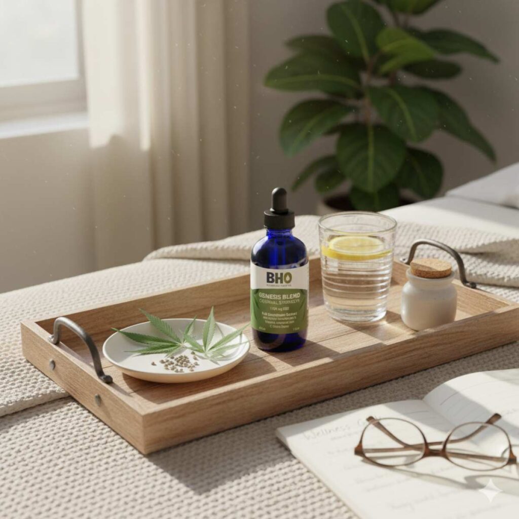 Bluegrass Hemp Oil Genesis Blend bottle on a wooden tray with a glass of lemon water, a small plate of hemp leaves and seeds, and an open wellness journal, bathed in soft morning light on a comfortable bed.